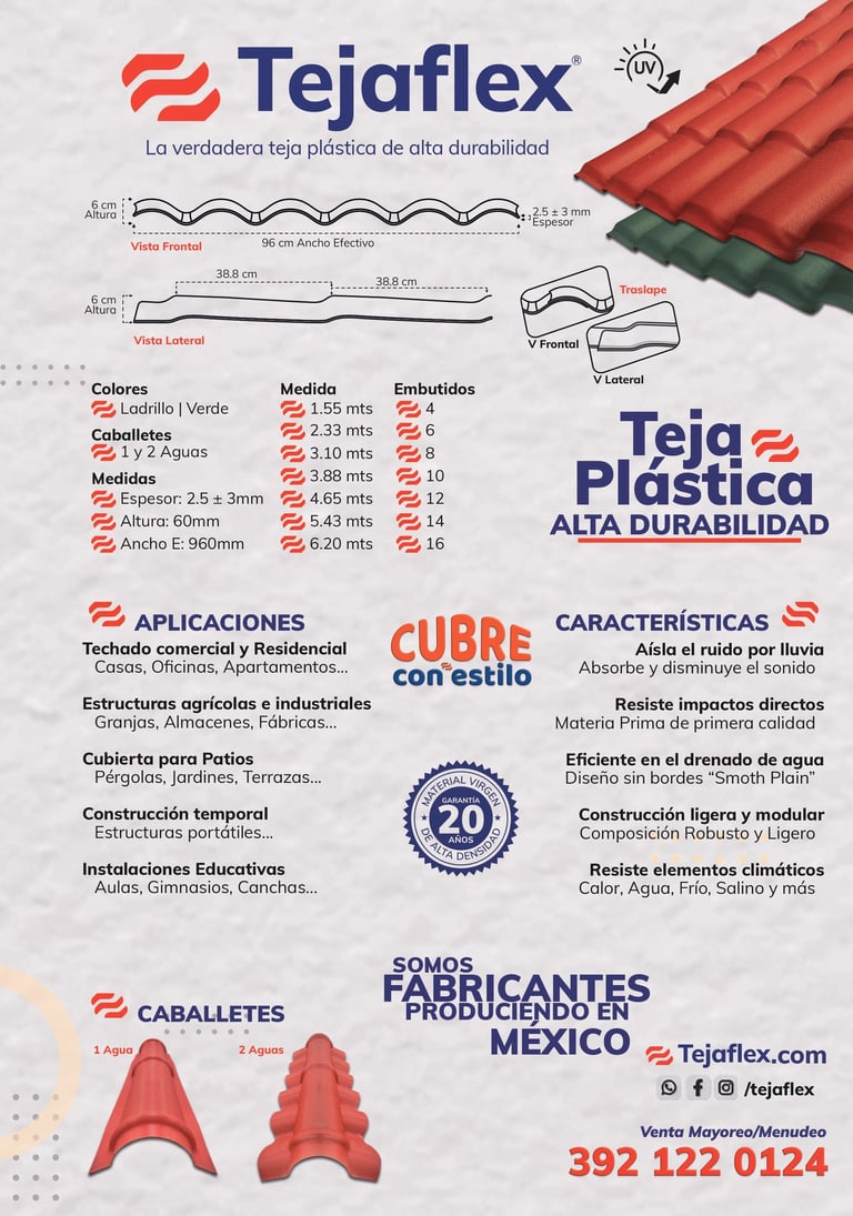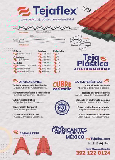 Tejaflex es una solución de techado avanzada que combina la estética clásica de la teja de barro con la resistencia y ligereza de los materiales sintéticos. Es una lámina diseñada para ofrecer un acabado arquitectónico premium sin las complicaciones de peso o mantenimiento de las tejas tradicionales.