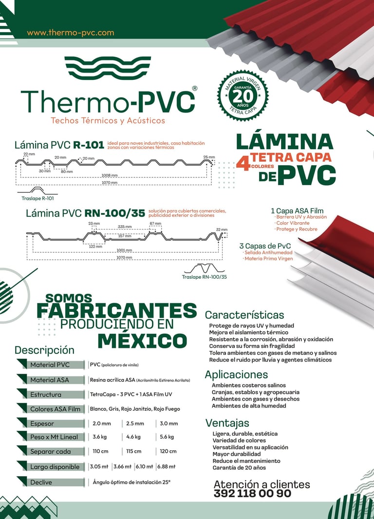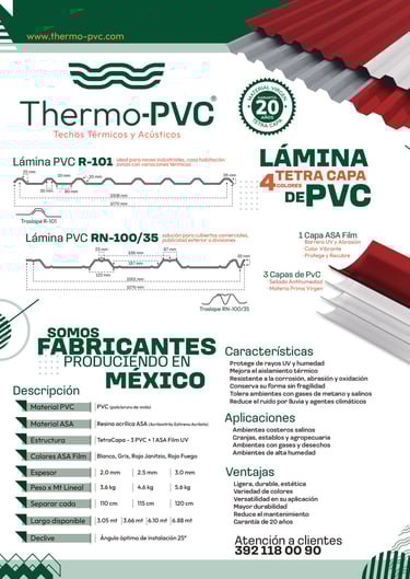 Thermo-PVC es una lámina termoacústica de alta tecnología diseñada para ofrecer el máximo aislamiento y resistencia en cubiertas industriales y residenciales. Está compuesta por capas de PVC especial que actúan como una barrera eficiente contra el calor y el ruido.